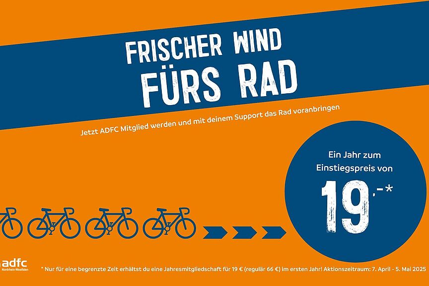 Nur für eine begrenzte Zeit erhältst du eine Jahresmitgliedschaft für 19 € (regulär 66 €) im ersten Jahr! Du erhältst das komplette Vorteilspaket inklusive Pannenhilfe, Rechtsschutz und Radwelt-Magazin für 12 Monate. Das Angebot gilt auch für Familien- und Haushaltsmitgliedschaften (regulär 78 €, Voraussetzung ist ein gemeinsamer Wohnsitz). Die Mitgliedschaft wird unbefristet abgeschlossen, ist aber jederzeit ohne Frist zum Ende des laufenden Beitragsjahres kündbar. Den vergünstigten Einstiegspreis kannst du nur einmal in Anspruch nehmen und auch nur dann, wenn du in den letzten 12 Monaten kein ADFC-Mitglied waren. Sollte das bei dir der Fall sein, nehmen wir dich gerne zum regulären Mitglieder-Tarif neu auf.